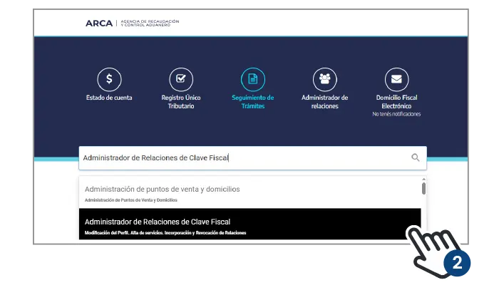2) En el campo de búsqueda escribir “Administrador de Relaciones de Clave Fiscal” para visualizar la opción correspondiente.