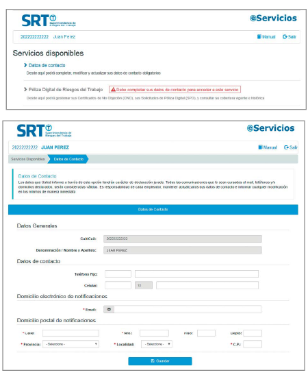 Como primer paso obligatorio estar adherido a e-servicios SRT y tener los datos de contacto actualizados.